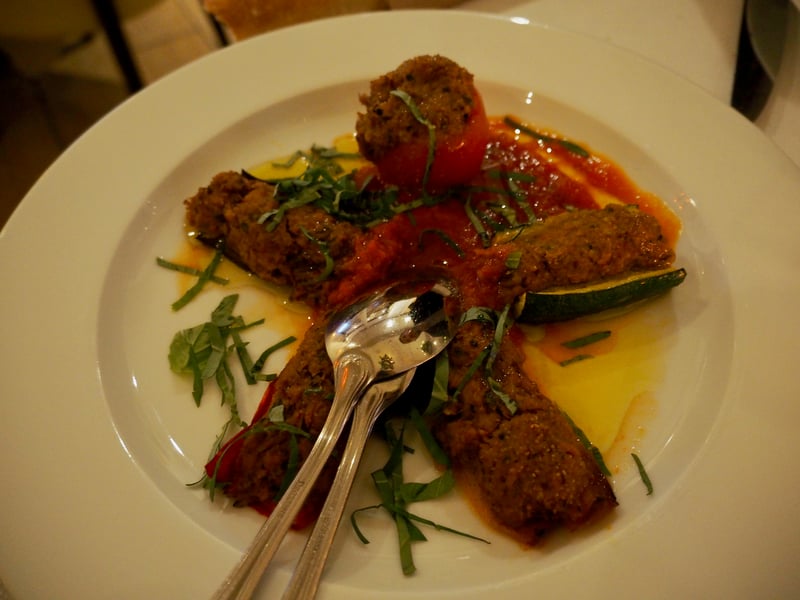 A l'heure du dîner, ous avions le choix entre le mythique Fouquet's et la petite Maison de Nicole. Et c'est La Petite Maison de Nicole qui l'a emporté avec sa cuisine qui met l'accent sur les saveurs méridionales le tout dans un cadre feutré. Nous avons adoré le style : il mixe parfaitement l'esprit du sud avec la décoration de table où sont disposées quelques légumes juxtaposant la grande bouteille d'huile d'olive mais aussi avec un environnement chic. La clientèle est plutôt variée à l'image de la fréquentation de l'hôtel : quelques couples, des familles avec jeunes enfants mais aussi quelques copines venues profiter du lieu. On retrouve le soleil dans les assiettes avec par exemple des fleurs de courgette en beignet mais aussi des petits farcis. La cuisine est délicieuse, l'ambiance est parfaite, une vraie belle soirée digne de la Croisette.