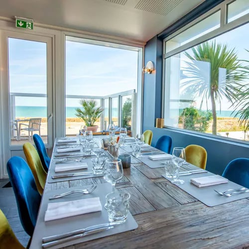 Ancienne villa balnéaire reconvertie face à la plage de Barneville, cette table distinguée par le Michelin déploie une salle spacieuse ouverte sur les îles Anglo-Normandes. La carte, renouvelée quotidiennement, privilégie la justesse du geste : œuf mollet au hareng fumé, merlu en émulsion beurrée aux œufs de hareng. Le menu, proposé midi et soir, offre un rapport qualité-prix remarquable dans une atmosphère de vacances assumée.