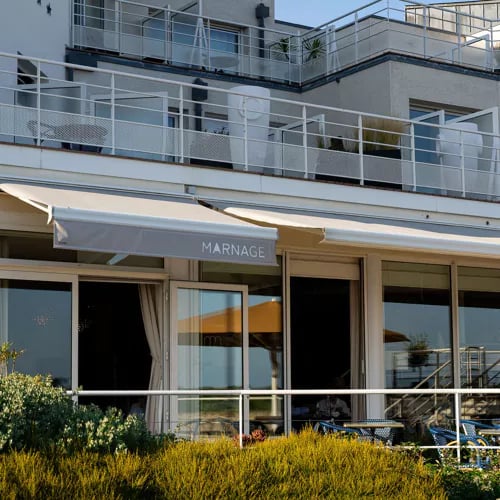 Face au pont tournant, les baies vitrées de cette table étoilée ouvrent sur le port en activité. Pierre et Lydie Marion y célèbrent exclusivement les produits de la mer du Cotentin : poissons de petits bateaux, homards, coquillages. La carte, entièrement sans viande, révèle des accents japonais et exotiques—rouget en salsa criolla, lieu jaune au yuzu et kéfir de lait, bar aux coques relevé de ginger beer. Une cuisine marine d'une précision remarquable.