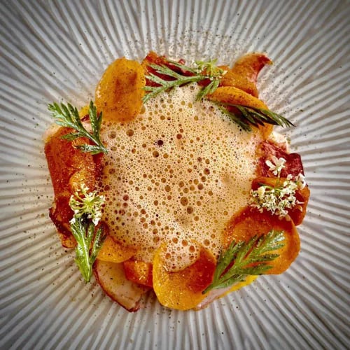 Ancienne pension pour jeunes filles reconvertie en table étoilée, Le Mascaret révèle le parcours singulier de Philippe Hardy, passé par de grandes maisons et l'ambassade de France à Sofia. Aux côtés de Nadia, ancienne danseuse étoile, il compose une cuisine moderne ancrée dans le terroir manchois : légumes du potager issus de semences paysannes, poissons sauvages et coquillages de la côte, servis à des tarifs remarquablement justes.