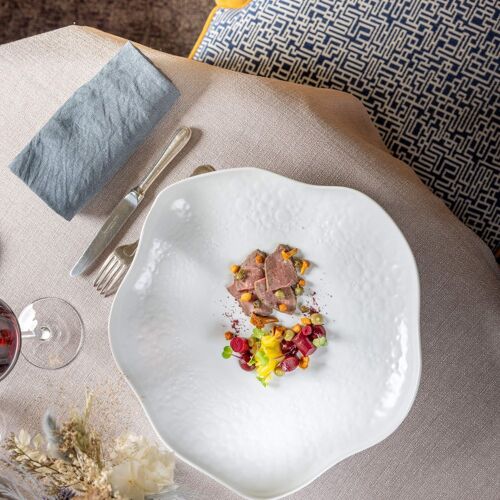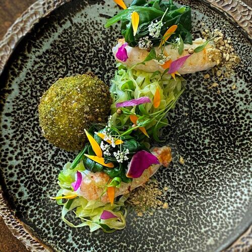 Cernée de vergers ouvrant sur la campagne tourangelle, cette table étoilée révèle la cuisine vive et colorée du chef Bastien Gillet. Les produits fermiers de la région, sélectionnés quotidiennement, se transforment en assiettes d'une subtilité remarquable où arômes et textures dialoguent avec justesse. La carte évolue au gré de l'inspiration, servie dans des céramiques artisanales façonnées localement—prolongement naturel d'une démarche résolument ancrée dans le terroir.