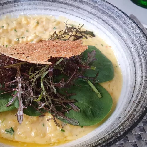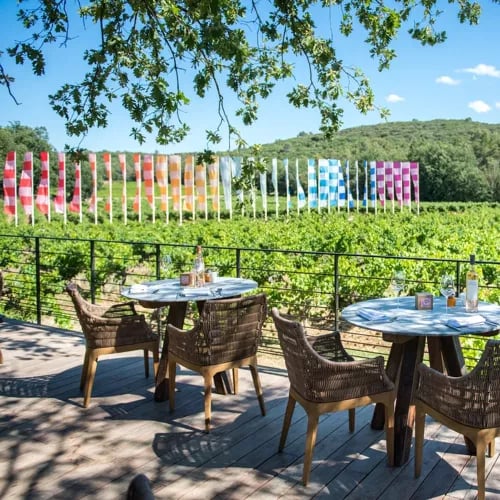 Les drapeaux colorés de Daniel Buren ondulent au-dessus des vignes biologiques du domaine de Peyrassol, où cette table étoilée cultive un dialogue constant entre art contemporain et terroir provençal. La cuisine, résolument écologique, s'appuie sur un potager maison, une ricotta artisanale et le miel des ruches voisines. Le thon rouge aux fleurs de courgette illustre une approche à la fois précise et parfumée, prolongée par les jardins sculptés et le centre d'art attenant.