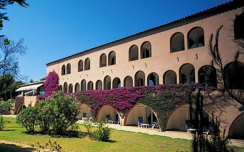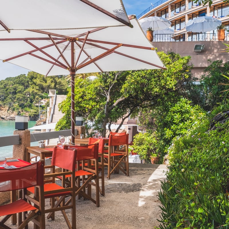 Ancré dans la baie d'Aiguebelle, cet établissement centenaire restauré par l'architecte Jean-Baptiste Pietri emprunte au vocabulaire naval ses boiseries et terrazzo, ses 40 chambres suspendues au-dessus des flots avec terrasses ouvertes sur les îles d'Or. Au sommet, le restaurant L'Oursin dévoile la cuisine d'Antoine Gras sous les fresques de Maki Ohkojima ; en contrebas, le spa L'Oiseau Bleu prolonge l'échappée avec piscine intérieure chauffée et jacuzzi.