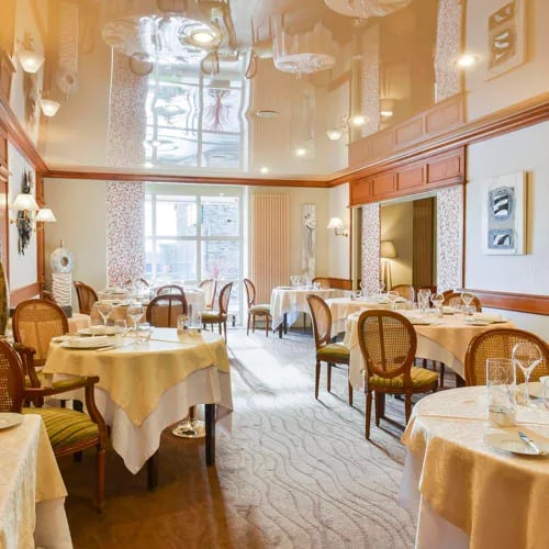 À quelques encablures du Mont, loin de l'agitation touristique, cette table accueille un nombre restreint de convives à chaque service. La carte célèbre le terroir normand—sole meunière, homard bleu, agneau de pré-salé—avec une transparence rare : une page entière dédiée aux producteurs. Une adresse de caractère, distinguée par le Guide Michelin, pour qui cherche l'authenticité plutôt que la facilité.