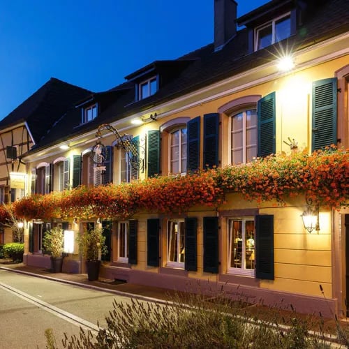 Ancien relais de poste du XVIIIe siècle aux façades fleuries, cette table étoilée perpétue l'excellence alsacienne sous la direction de Laurent Arbeit, formé chez Haeberlin et Ducasse. Foie gras de canard, truite rose du Sundgau, pigeonneau fermier : chaque assiette témoigne d'un attachement rigoureux au terroir régional. Des chambres décorées à l'alsacienne permettent de prolonger l'escale gourmande.