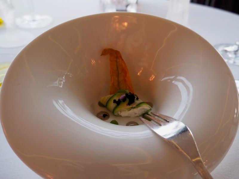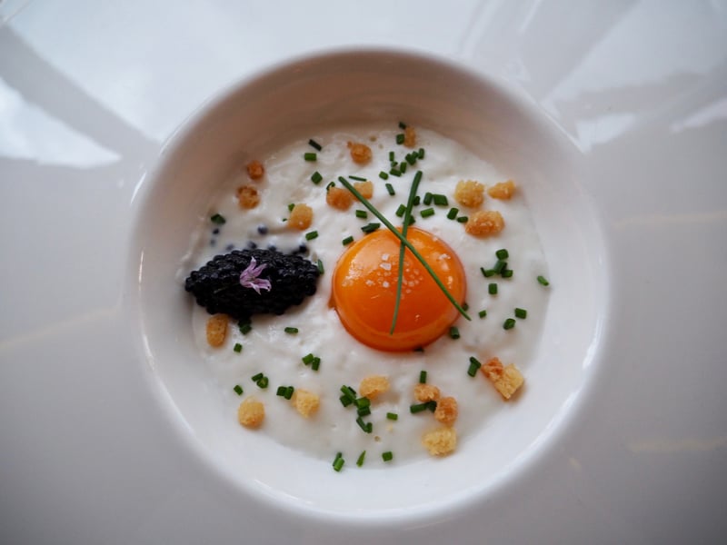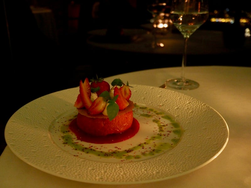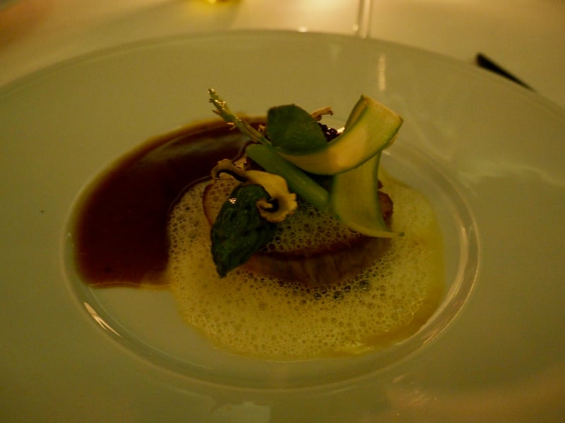 Difficile de débuter le diner sans trinquer avec une coupe de champagne, le tout accompagné de petits canapés. Pour découvrir la cuisine du chef, la meilleure option est de se tourner vers le menu dégustation, ce que nous avons fait bien évidemment! Et dès le début du repas, le niveau est au plus haut : «comme un œuf au plat en surprise de caviar Avruga» tient du sublime. Ce trompe l'oeil est aussi beau que bon, je suis absolument sous le charme de ce plat ! Bord de mer oblige, on continue avec un ceviche de bonite sauvage puis par un Saint Pierre infusé aux agrumes de Menton. Frais, savoureux, le menu dégustation fait la part belle aux produits de la mer pour débuter ce repas gastro. Les assiettes sont dressées de façon impeccable et mes papilles s'émerveillent. Pour la suite, ce sera un filet de veau doré au sautoir accompagné d'asperges et de morilles: des produits de saison et une cuisson parfaitement maitrisée qui m'ont charmé.