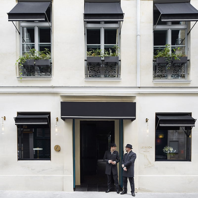 Les intérieurs de Sarah Lavoine—marbre de Carrare, parquet en noyer, canapés de velours chocolat et bleu marine—installent une atmosphère sombre et raffinée dans 37 chambres, jusqu'à la suite Saint Roch dotée de sa propre cave à vin et de son hammam. En sous-sol, une piscine aux chandelles tapissée d'ardoise ancre l'espace spa, équipé d'un bain turc et d'un centre de fitness. Le bar à cocktails attire les habitués du quartier dans le jardin intérieur et sur la terrasse.
