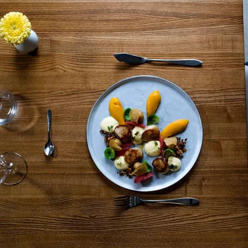 Face à la plage Saint-Guirec et ses célèbres rochers de granit rose, La Table de mon Père déploie une cuisine bretonne contemporaine dans un cadre épuré baigné par la lumière du couchant. Le pigeon du Ménez Bré côtoie l'araignée de mer et la lotte, tandis que les asperges blanches ponctuent des assiettes soignées. Une cave généreuse accompagne ces créations distinguées par le Guide Michelin.