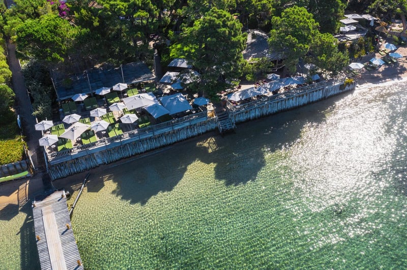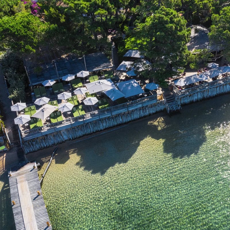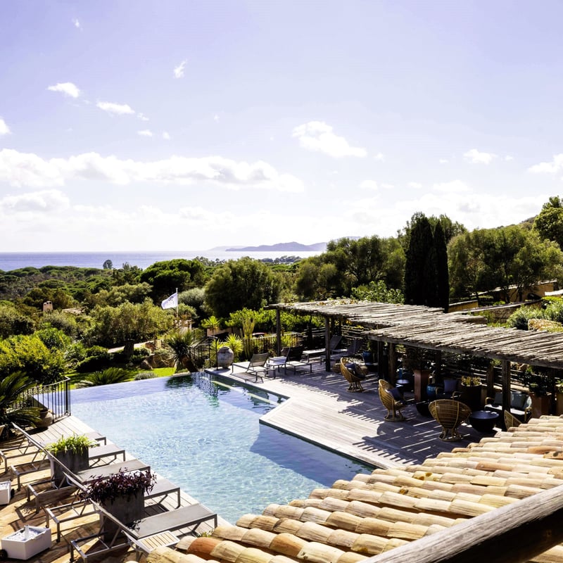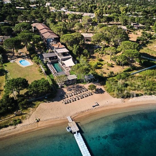 Depuis quatre générations, la famille Canarelli façonne ce Relais & Châteaux ancré sur une plage de sable fin, dans une anse protégée du golfe de Porto-Vecchio. La cabane sur pilotis, suspendue face à la mer, se réserve des mois à l'avance. Le Spa Nucca déploie 550 mètres carrés de soins aux essences du maquis — ciste, immortelle, myrte — confectionnées sur place. À La Pinède, les légumes du potager nourrissent une cuisine méditerranéenne d'une précision remarquable.