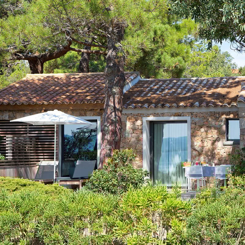 Treize maisonnettes de pierre essaiment sur une colline plantée d'oliviers, entre Porto-Vecchio et la plage de Palombaggia, chacune conçue et bâtie par la famille Bougon. Murs blanchis à la chaux, plafonds à poutres apparentes, bassins privés sur terrasses de bois : l'ensemble cultive une rusticité élégante devenue rare sur l'île. Aucun restaurant, mais un petit-déjeuner livré à la villa et, l'après-midi, vins et fromages corses — un repaire pour qui recherche l'intimité absolue.