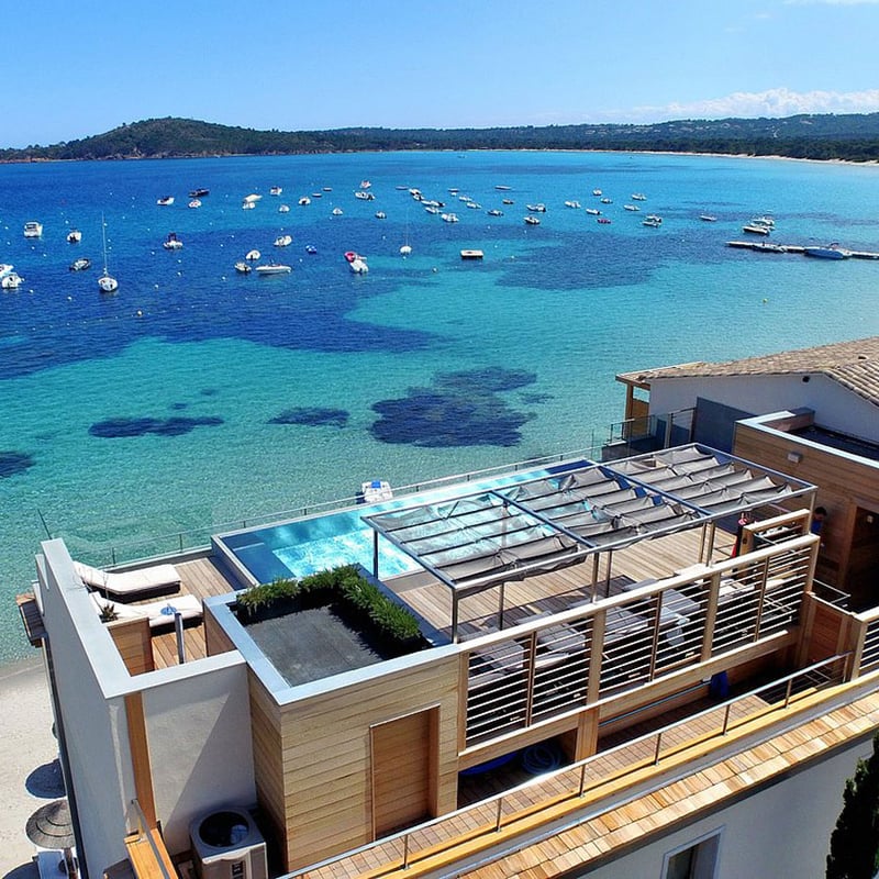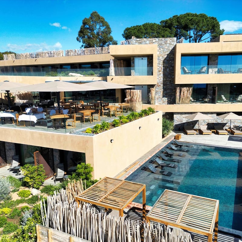 Sur la baie de Pinarellu, échancrure préservée de la côte sud-est corse, ce quatre-étoiles de 34 chambres déploie une élégance contemporaine aux lignes épurées. Les chambres contemplent la Méditerranée ou les jardins, tandis qu'une piscine à débordement en toiture embrasse l'horizon. Le spa Phytomer et son hammam prolongent les journées de plage, et La Table du Pinarello pose ses couverts face aux flots.