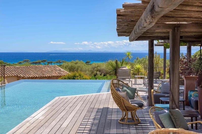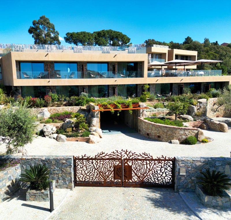 L'architecture de Jean-François Bodin, alliance de cèdre patiné et de verre, cadre chaque perspective sur le golfe de Porto-Vecchio. Les 34 chambres avec terrasse, meublées de pièces signées Le Corbusier et Bertoia, dominent un parc de deux hectares planté d'oliviers et de cyprès descendant vers une anse privée. La piscine à débordement de 25 mètres surplombe la baie, tandis que le chef Fabio Bragagnolo orchestre la seule table deux étoiles Michelin de l'île.