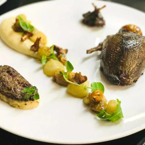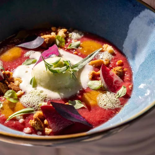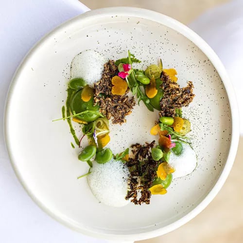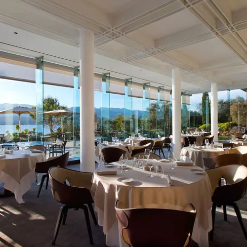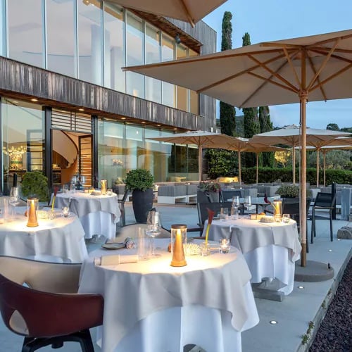 Dominant la baie de Porto-Vecchio, la table doublement étoilée du chef Fabio Bragagnolo célèbre les produits de la mer à travers un prisme corso-italien d'une grande finesse. Le saint-pierre confit à l'huile d'olive, lentilles corail, burrata et émulsion d'eau de tomate révèle une maîtrise technique affirmée, prolongée par des desserts peu sucrés associant framboise, pomelo corse, ganache au genièvre et géranium rosat.