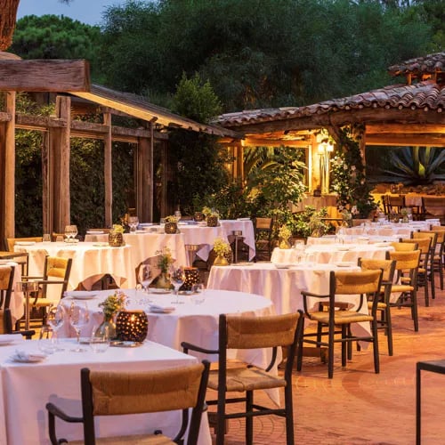 Chaque matin, les chefs Pascal Cayeux et Gauthier Devillers cueillent herbes, légumes et fruits dans un potager biologique de trois mille mètres carrés, composant une cuisine méditerranéenne ancrée dans le terroir corse. Le déjeuner se prend les pieds dans le sable, le dîner sous la tonnelle ; une cave d'affinage prolonge le repas avec des fromages soigneusement sélectionnés.