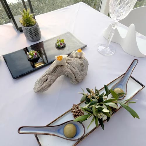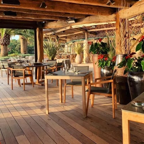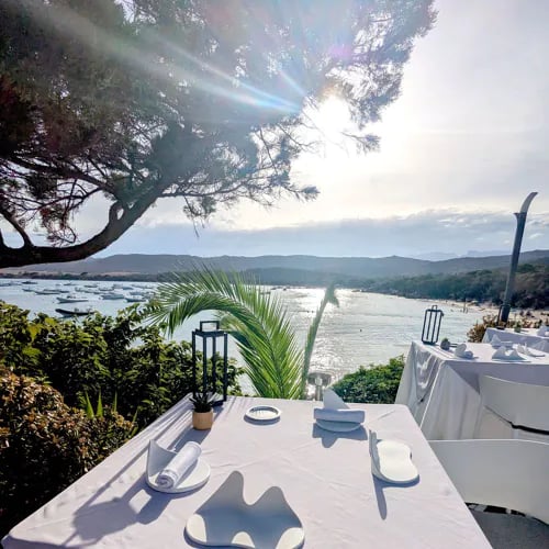 Dominant la plage de Palombaggia depuis les hauteurs parfumées du maquis, La Table de Mina déploie une cuisine méditerranéenne contemporaine sur une terrasse paisible au bord de la piscine à débordement. La carte, volontairement concise, met en lumière charcuteries corses d'exception, veau local aux olives sur lit de polenta onctueuse et fiadone traditionnel au citron. Le mardi soir, un menu unique célèbre les spécialités insulaires face aux îles Cerbicales.