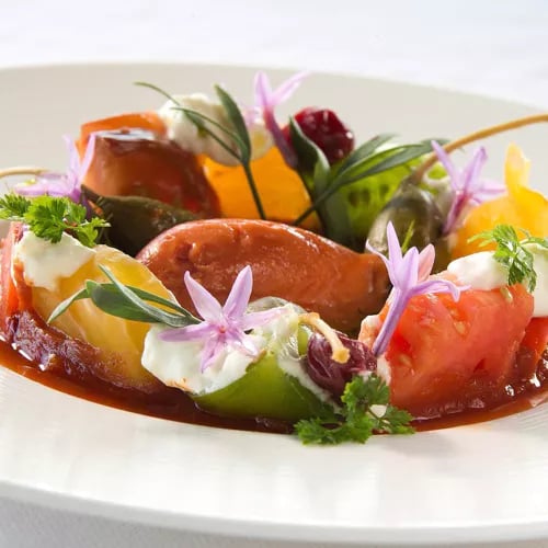 La cuisine méditerranéenne de saison s'exprime ici avec franchise : courgettes, aubergines, poissons du littoral et agneau de La Crau, relevés d'huile d'olive et de citron. La terrasse plein sud domine un jardin soigné où les déjeuners s'étirent sous le soleil provençal. Au bout d'une prairie fleurie, quelques chambres aux couleurs du Midi permettent de prolonger l'escale au-delà du repas.