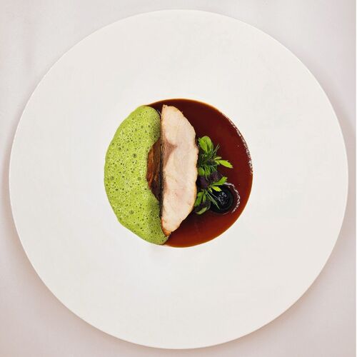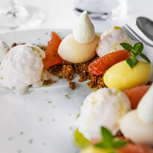 Sous un plafond blanc incurvé ponctué d'œuvres de Francis Guerrier, la cheffe Fanny Rey compose une cuisine doublement étoilée où végétaux et produits de la mer célèbrent le terroir des Alpilles. Ses menus, résolument ancrés dans le marché, trouvent leur apothéose dans les desserts de Jonathan Wahid, champion de France de pâtisserie, qui magnifie figues et fraises gorgées de soleil provençal.