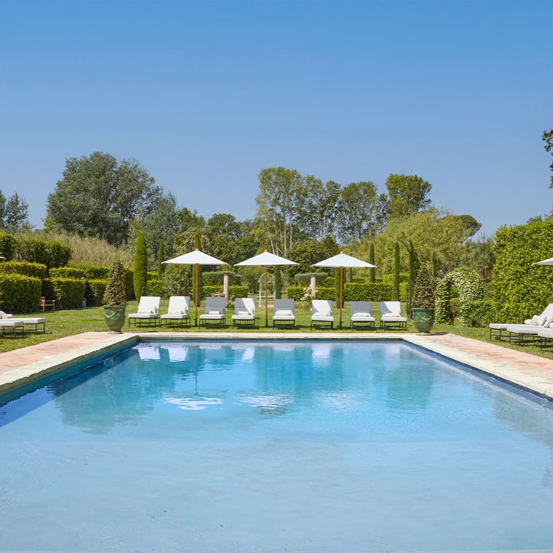 Une allée bordée de platanes mène à cet ensemble bâti — mas médiéval, manoir du XIXe siècle, chapelle et ancien lavoir — disséminé dans un parc planté de cyprès centenaires. Les chambres du manoir conservent cheminées d'époque et plafonds hauts, tandis que le salon Belle Époque scintille sous les lustres de cristal. L'été, déjeuners au bord de la piscine accompagnés de rosé à volonté ; toute l'année, hammams et jardins paysagers comblent les amateurs de quiétude provençale.