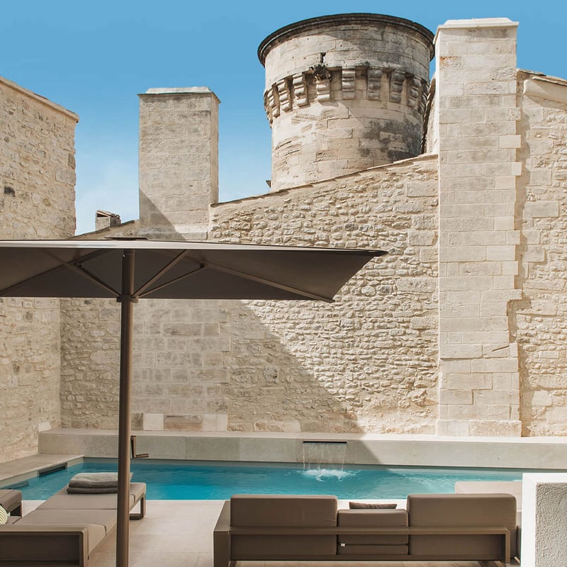 Bâti en 1650 pour la famille Tourrel d'Almeran, cet hôtel particulier dévoile ses stucs d'origine et son escalier monumental en grès sous une écriture résolument contemporaine — mobilier signé Eileen Gray, pièces de Konstantin Grcic. Neuf suites seulement, une Table étoilée célébrant l'agneau de la Crau et les poissons locaux, un rooftop estival face aux toits du village. Réservé aux adultes, avec piscine extérieure au centre du bourg.