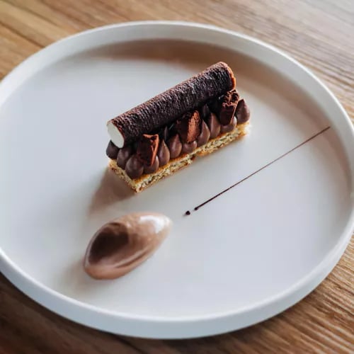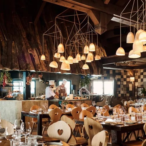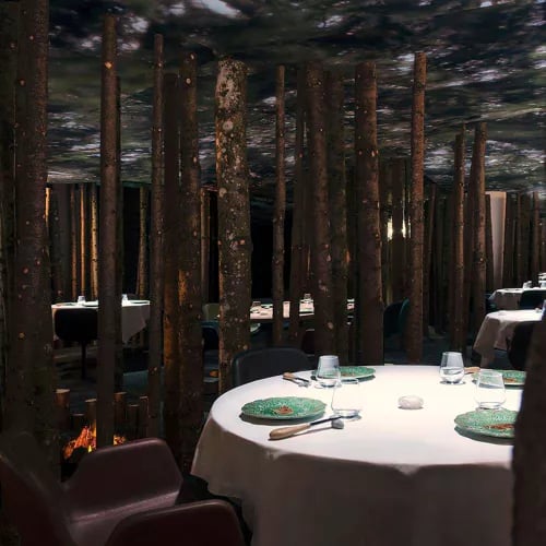 Des troncs élancés fragmentent la salle en clairières intimes sous un plafond de feuillages peints, tandis que de somptueuses tables en noyer accueillent la cuisine alpine inventive de Clément Bouvier, ancien second de Jean-François Piège. Poissons d'eau douce, gibier et herbes cueillies en altitude composent des assiettes étoilées et durables. Le chariot de fromages, exclusivement alpin, dialogue avec une carte des vins remarquable.