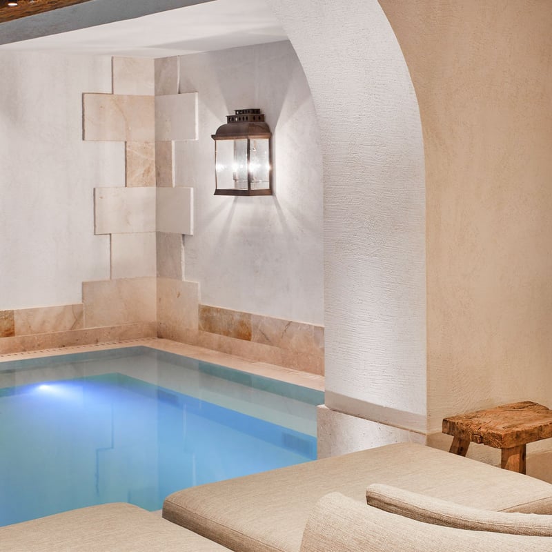 Une piscine intérieure de vingt mètres inspirée d'un lavoir médiéval constitue le cœur de ce spa Guerlain de 1 200 mètres carrés, habillé de poutres apparentes et de teintes ocre chaleureuses. Cinq cabines de soins, dont une suite VIP pour duo, proposent des rituels exclusifs créés pour cette adresse, notamment le massage aux pierres chaudes « Douceur de l'Hiver », pensé pour la récupération après le ski. Hammam et piscine-grotte pour enfants complètent l'ensemble.