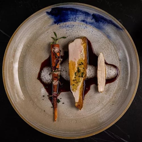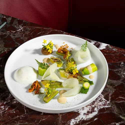 Figure majeure de la gastronomie allemande, Thomas Bühner déploie sur le campus METRO de Düsseldorf une cuisine française aux accents asiatiques, couronnée d'une étoile Michelin. Deux menus du soir—omnivore et végétalien—mettent en valeur des produits régionaux d'exception, dont son cabillaud au bouillon safrané. Le décor signé Kitzig Design Studios, aux teintes chaleureuses, s'ouvre sur une cuisine vitrée qui participe au spectacle.