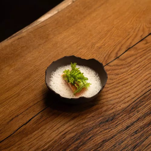 Sous l'immense halle gourmande The Crown, l'une des plus vastes d'Europe, une étoile Michelin brille dans un sous-sol inattendu. Le chef Egor Hopp y déploie une cuisine thaïe contemporaine rehaussée d'accents kazakhs—crème smetana, raschenka—dans des assiettes épurées et créatives. Le menu du soir en six services séduit les palais curieux, tandis que la table du chef dévoile l'intimité d'une brigade au travail.