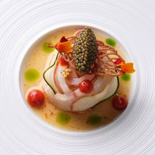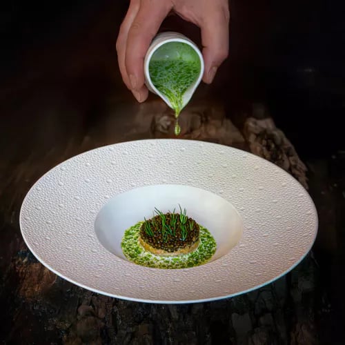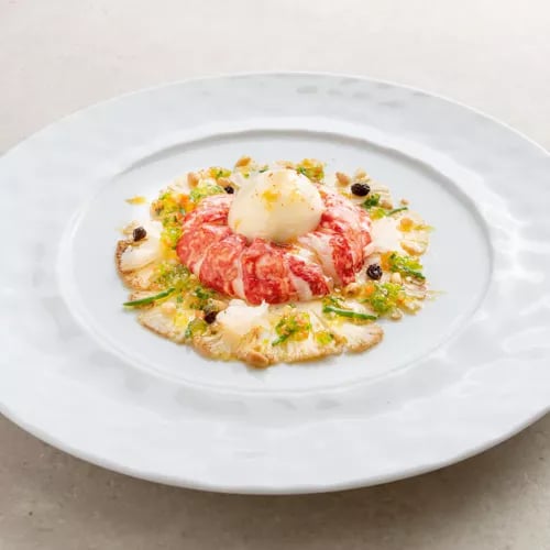 Depuis plus de trois décennies, Claus-Peter Lumpp orchestre aux fourneaux du Bareiss une cuisine française classique teintée d'influences internationales, couronnée de trois étoiles. L'amuse-bouche signature—ravioles de homard tiédies, bouillon pastèque-mélisse relevé de piment—annonce la rigueur du repas. Les desserts élaborés de Stefan Leitner et le chariot de pralines prolongent le festin dans une salle redessinée, éclairée de lampes en albâtre. Service également au déjeuner.