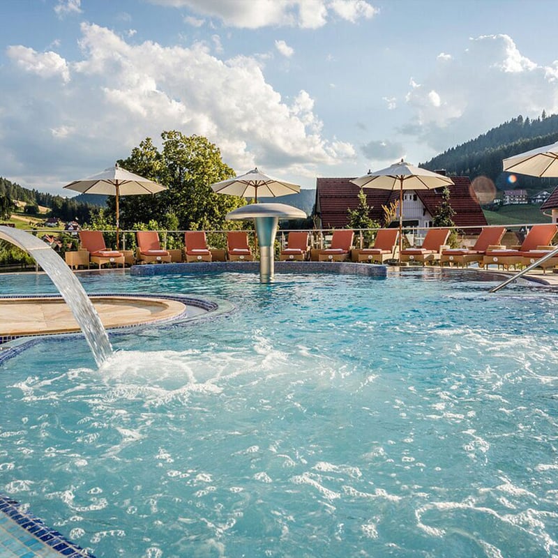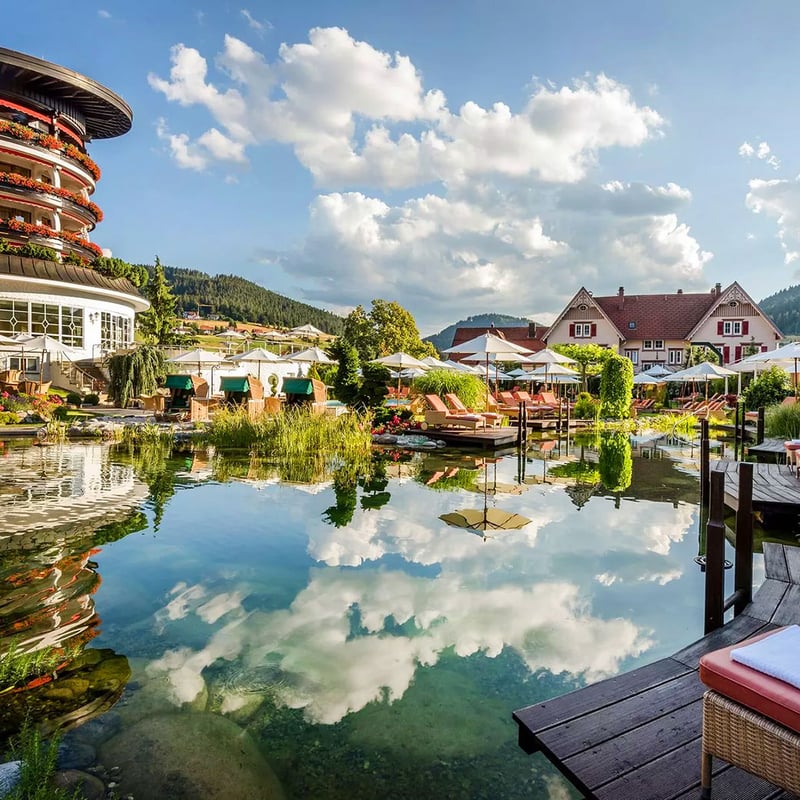 Ce refuge réservé aux adultes déploie un complexe de bien-être de 1 600 mètres carrés avec hammam, sauna et piscines intérieure et extérieure. Parmi les 63 chambres personnalisées figure la Jungbrunnensuite, tandis que la table étoilée Berlin Krone côtoie un restaurant dédié aux spécialités souabes. Un pavillon de randonnée, à un kilomètre, prolonge l'expérience forestière du Schwarzwald.