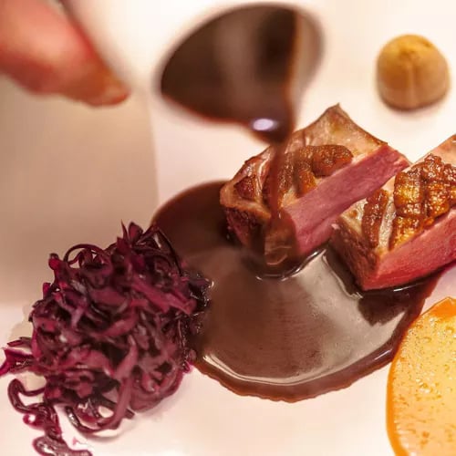 À l'ombre du monastère cistercien de Neuzelle, édifice du XIIIe siècle, cette table Bib Gourmand arbore l'Étoile Verte Michelin pour son approvisionnement quasi exclusif dans un rayon de cinquante kilomètres. La cuisine ouverte livre des assiettes terriennes aux saveurs franches, dont une betterave déclinée en textures multiples, relevée de flocons de fromage de chèvre. La maison distille même son propre gin.