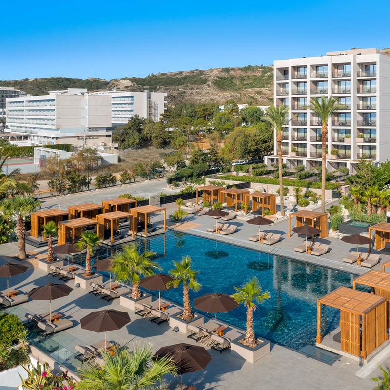 Sur le versant méridional de Rhodes, loin de l'agitation touristique, l'Atrium Prestige déploie ses terrasses jusqu'à une plage de sable fin quasi privée. L'établissement excelle par la qualité de ses prestations — commande de cocktails depuis son transat via application, service attentionné aux abords des vastes piscines. Les familles y trouvent un club enfants, un minigolf et un bassin dédié aux plus jeunes, tandis que les adultes profitent d'espaces pensés pour la détente.