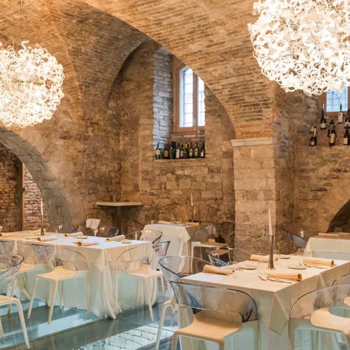 À Cannara, aux portes d'Assise, Perbacco rend hommage à la cuisine ombrienne avec une élégance discrète. L'oignon y tient le premier rôle, sublimé dans une soupe gratinée au gruyère devenue signature de la maison. Le propriétaire Ernesto conseille avec passion les vins régionaux, accordant chaque cuvée aux assiettes généreuses et franches. Une adresse Bib Gourmand pour les fins palais attentifs au rapport qualité-prix.