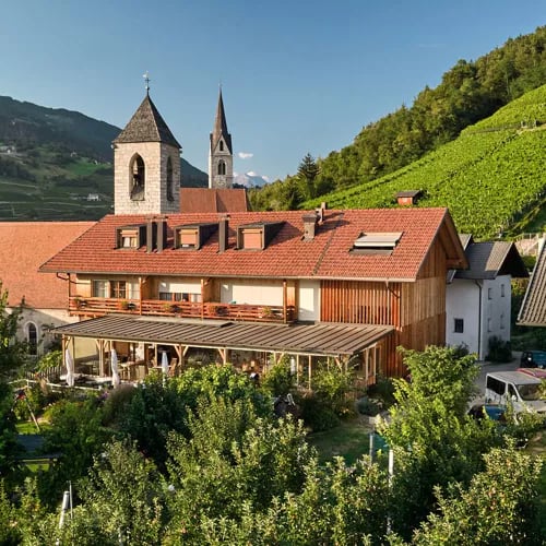 Les fondations médiévales de cette demeure du XIIIe siècle confèrent à ses douze suites une authenticité rare, entre poutres d'origine, volumes atypiques et mobilier contemporain soigné. La table gastronomique décline une cuisine sud-tyrolienne rigoureuse, accompagnée de crus de l'Alto Adige issus de la cave privée. Sauna et excursions viticoles prolongent l'expérience pour les amateurs d'histoire et de grands vins alpins.