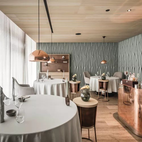 Les boiseries anciennes confèrent à cette table de l'historique hôtel Elephant une élégance tyrolienne singulière. La cuisine revisite le terroir sud-tyrolien avec une sensibilité créative : l'omble chevalier se pare d'une crème de céleri, de pomme verte et de fleurs de sureau. Une cave impressionnante, forte de près de mille références, accompagne ces assiettes travaillées avec une précision remarquable.
