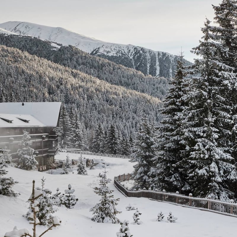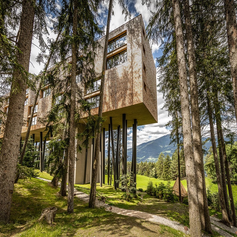 Le plus grand hôtel-cabane d'Italie s'élève à 25 mètres du sol sur des piliers d'acier imitant des troncs d'arbres, au milieu des forêts de pins du Tyrol du Sud. Ses 104 suites habillées de mélèze et de sapin récupérés ouvrent sur les Dolomites par de vastes baies vitrées. Le spa Arboris déploie 2 500 m² sur deux niveaux, dont une piscine à débordement dominant la vallée d'Isarco. Réservé aux adultes, formule tout inclus, pistes de Plose au pied de l'hôtel.