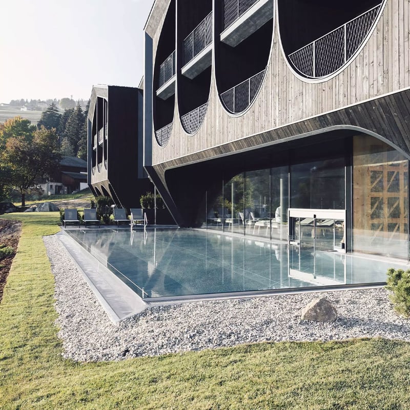 L'architecte milanais Peter Pichler a imaginé ce refuge de 25 chambres aux lignes asymétriques, habillé de mélèze gris ardoise aux courbes organiques face aux Dolomites. Le frêne blond dialogue avec les lainages vert forêt dans des intérieurs épurés. Spa, sauna et cuisine tyrolienne aux produits du terroir rythment les journées après les escapades en montagne, été comme hiver.