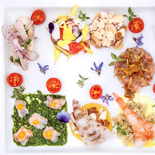 Sur le lungomare d'Albaro, Santamonica déploie sa terrasse estivale et sa salle vitrée face aux flots liguriens. La carte puise l'essentiel de ses ingrédients dans cette mer omniprésente : les préparations crues occupent une place considérable, tandis que les assiettes cuisinées affichent une facture résolument moderne, graphique et précise. Une table de caractère pour les amateurs de produits marins traités avec audace contemporaine.