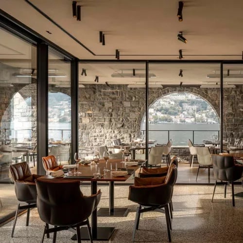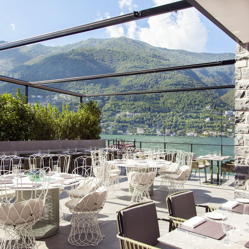 En contrebas du village de Torno, la terrasse estivale d'Il Sereno Al Lago s'ouvre par de grandes arcades sur le lac et ses rives opposées, dans l'écrin architectural signé Patricia Urquiola. Le chef napolitain Raffaele Lenzi, une étoile Michelin, compose une cuisine de terroir revisitée aux accents lombards, asiatiques et végétaux. La carte des vins privilégie les grands rouges italiens, notamment en verticales de millésimes anciens.
