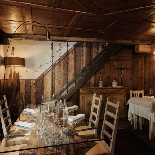 Murs de pierre et boiseries odorantes composent le décor de cette table étoilée au sein de l'Hotel Bertelli, où le chef Sabino Fortunato signe une cuisine alpine d'une précision technique remarquable. Gibier, poissons d'eau douce et préparations fumées au foin dialoguent avec des accents méditerranéens, tandis que la cave — plus de 800 références choisies avec discernement — ravit les amateurs éclairés.