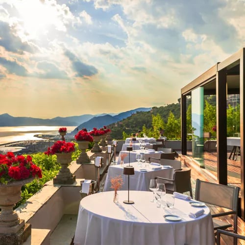 Face au petit port, l'ancienne adresse d'Il Pitosforo accueille désormais la table de Carlo Cracco, dont la terrasse embrasse la piazzetta et le golfe. Le chef exécutif Mattia Pecis signe des menus dégustation de sept ou onze services, mêlant références ligures et technique contemporaine mesurée—légumes du potager de montagne voisin, poissons affinés en chambre froide. Dès dix-huit heures trente, l'apéritif précède le dîner en plein air.
