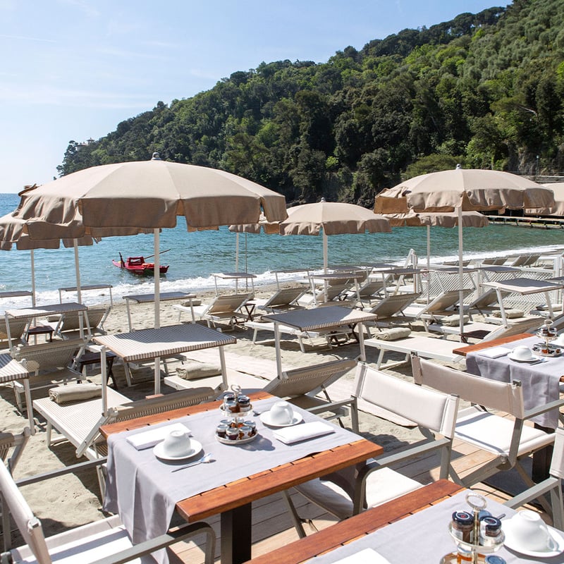 Une crique privée de sable fin, cernée de falaises abruptes, offre son décor spectaculaire à cet établissement de douze chambres seulement. Sous les verrières zénithales, des alcôves romantiques se parent de drapés vaporeux et de voilages délicats. La terrasse privative et son jacuzzi dominent la baie de Paraggi, tandis qu'une navette rejoint le front de mer coloré de Portofino en quelques minutes.