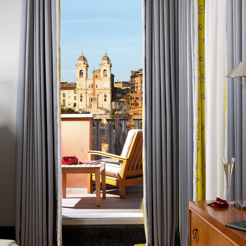 Propriété de la famille Ferragamo, cette adresse confidentielle de quatorze suites surplombe la Via Condotti depuis un palazzetto du XIXe siècle. Michele Bonan y a déployé ascenseur gainé de cuir de sanglier, rideaux de soie et photographies du Rome des années cinquante. Les animaux de compagnie sont bienvenus, et le salon en terrasse offre cheminée et vue plongeante sur la Piazza di Spagna.