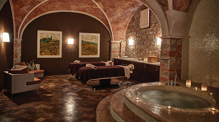 Dans les caves voûtées d'un château du Xe siècle, Essere Spa déploie 502 mètres carrés de salles en pierre restaurées où veillent des vestiges étrusques. Le rituel DiVino débute par un bain de vin rouge enrichi d'huile de pépins de raisin et de miel du domaine, tandis que des bassins d'inspiration romaine bordent un jardin privé face aux collines toscanes. Des ateliers conçus avec des archéologues transmettent les secrets de beauté étrusques.