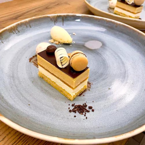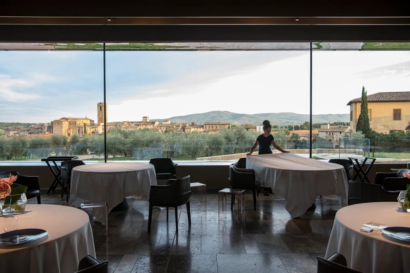 Derrière une façade de fer et de verre ouverte sur le paysage toscan, le chef Gaetano Trovato, Mentor Chef Award 2024, déploie une cuisine doublement étoilée ancrée dans le terroir : bœuf Chianina, poulet du Valdarno, pain artisanal signature. La cuisine ouverte, encadrée de marbre jaune de Sienne, offre un spectacle à part entière, tandis qu'une cave de 7 000 références accompagne chaque service.