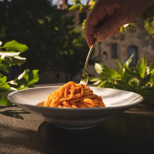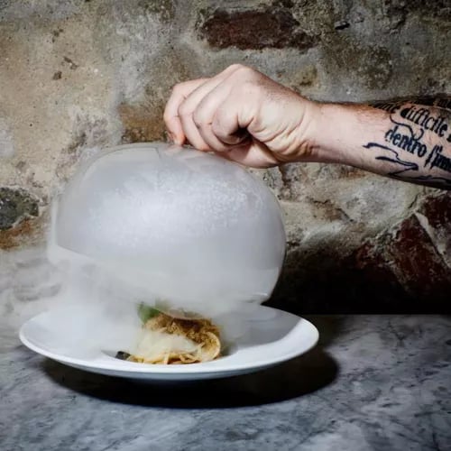 Sous les voûtes d'un ancien moulin à huile du XIXe siècle, meule et pressoir d'origine témoignent encore de l'histoire des lieux. La cuisine créative surprend par sa précision technique : spaghetti fumés, anchois et crème d'ail noir ; foie aux griottes et pistaches. L'été, les tables investissent la piazza pour des dîners toscans où l'inventivité répond à la tradition.