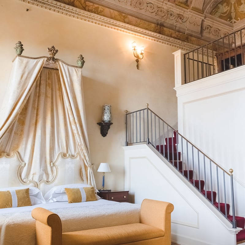 Seul cinq-étoiles intra-muros de Sienne, le Palazzo Gori du XVIIe siècle conserve ses fresques d'origine, sols en terre cuite et salle de bal fastueuse. Les 51 chambres affichent chacune une personnalité propre — plafonds peints ou à poutres, mobilier d'époque. Sous la coupole de verre du patio, le restaurant Sapordovino accueille les convives, tandis que suites communicantes et politique pet-friendly séduisent les familles.