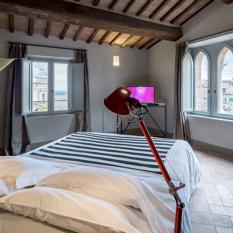 Palazzo de brique du XIIIe siècle conservant sa façade en fer forgé d'origine, ce neuf-chambres marie fauteuils Pedrali, luminaires Artémide et mobilier aux couleurs héraldiques siennoises. La Suite 3 abrite une baignoire dans un cube de verre et béton; d'autres chambres intègrent des fontaines anciennes reconverties en lavabos. L'enoteca aux chandelles et l'accueil des animaux séduisent œnophiles et passionnés de design parcourant la Toscane.