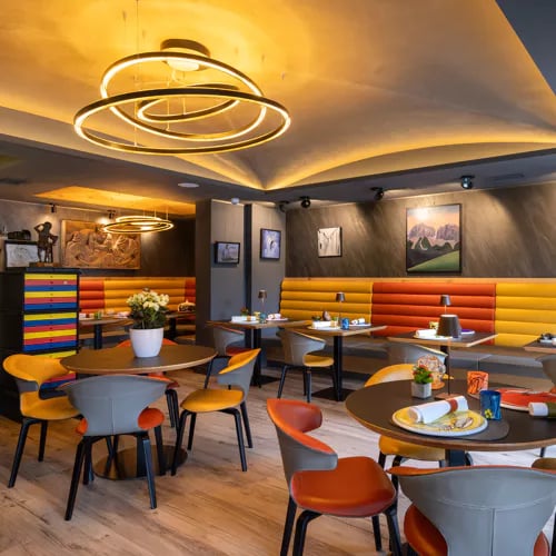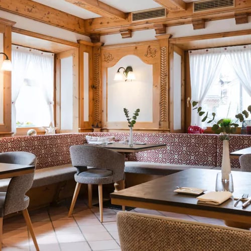 Boiseries anciennes et recoins intimes confèrent à Wine & Dine l'atmosphère chaleureuse d'un refuge alpin traditionnel, tandis que la cuisine emprunte une voie résolument contemporaine. Les assiettes créatives côtoient d'étonnantes spécialités de poisson, contrepoint inattendu aux cimes dolomitiques qui encadrent chaque fenêtre. La clientèle locale, fidèle et nombreuse, témoigne d'une table sincère en altitude.