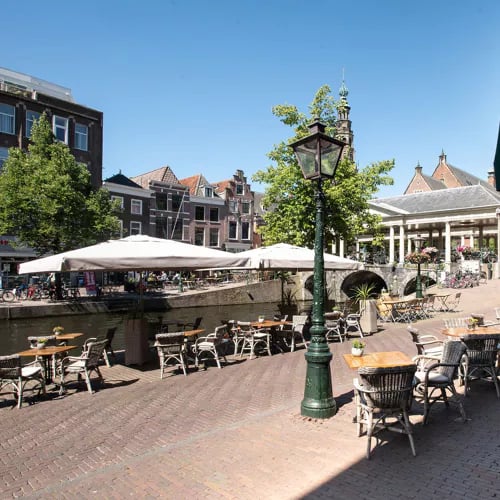 Les canaux du Nieuwe Rijn et de l'Oude Rijn concentrent les meilleures terrasses. Les abords du pont couvert Koornbrug sont particulièrement agréables, avec des tables de café au ras de l'eau et une vue sur les bateaux passant sous les ponts historiques.