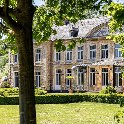 Sous les voûtes de pierre d'un château du XIIe siècle, les salles de soins occupent d'anciennes caves où la minéralité brute et le bois patiné composent une atmosphère singulière. Une piscine d'inspiration romaine s'ouvre par de larges baies sur la vallée de la Geul, tandis que hammam turc et sauna prolongent l'expérience souterraine, à quelques pas des vignes et jardins aromatiques du domaine.